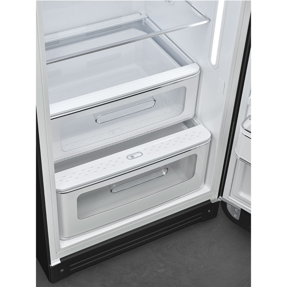 Szereted a retró stílust? Akkor a Smeg kombinált hűtő-fagyasztója a tökéletes választás számodra! A 50-es évek stílusában megálmodott, matt fekete 270 literes hűtőszekrény fagyasztóval krétával írható táblafesték felülettel rendelkezik. Az A-G osztályozású energiahatékonysági címkének köszönhetően könnyedén összehasonlíthatod más termékekkel. A belső tér gazdagított és finomított részletekkel rendelkezik, melyek tökéletesen koordinálnak a külsővel. Az állítható perforált fiók lehetővé teszi a szellőzés és a páratartalom személyre szabását. A LED világítás és az oldalsó termosztát pedig még kényelmesebbé teszi az életedet!
