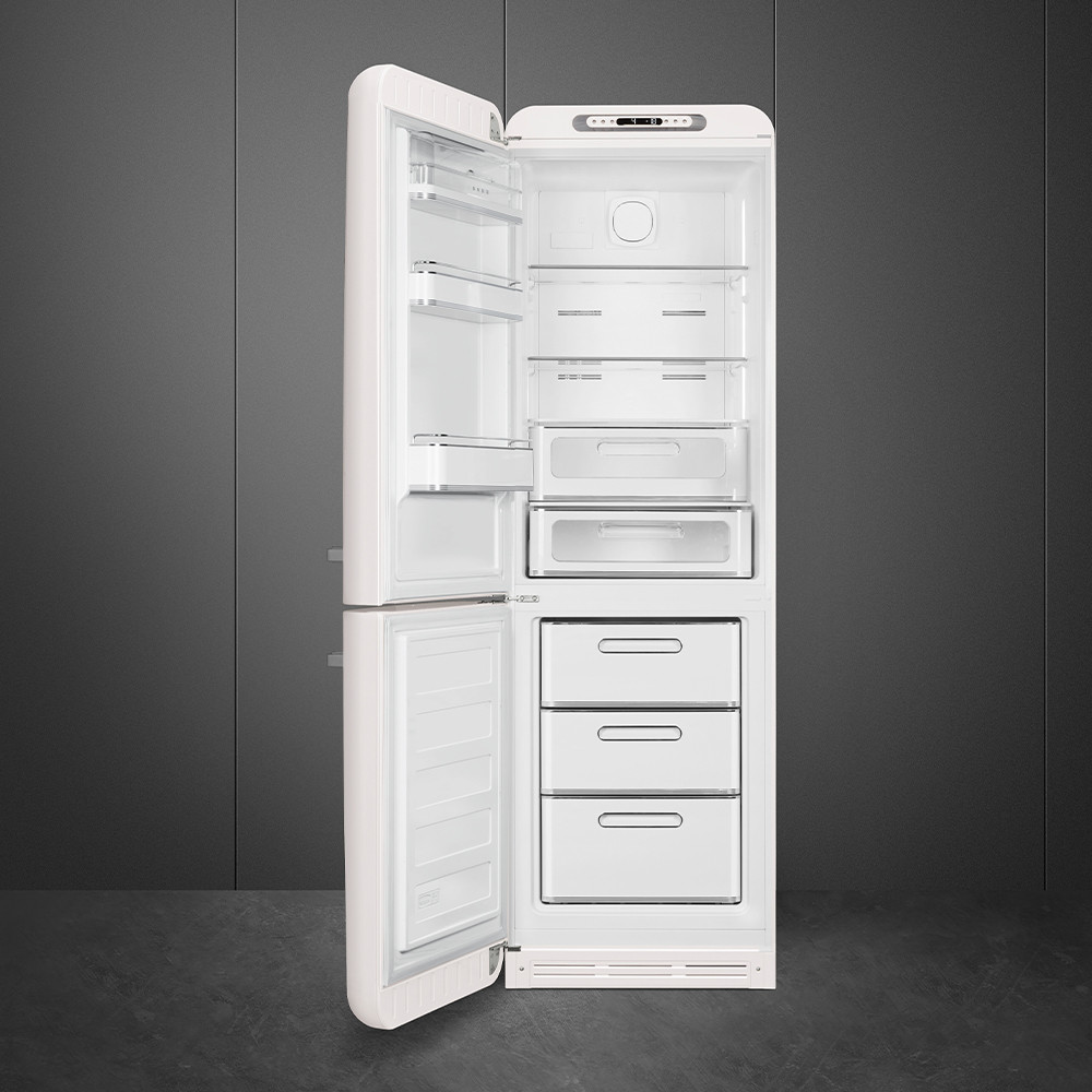 Szereted a retró stílust? Akkor ez a Smeg kombinált hűtő és fagyasztó a te választásod! A 50-es évek ikonikus designját ötvözi a legmodernebb technológiával. A hűtőszekrény digitális elektronikus vezérlőpanelje és a LED világítás tökéletesen illik a kerekded formákhoz és króm részletekhez. A fagyasztó rész 3 fiókkal rendelkezik, beleértve a gyorsfagyasztó funkciót és a No Frost rendszert, így sosem kell kézzel olvasztani. A kombinált hűtő és fagyasztó 331 literes űrtartalmával és a kiváló minőségű technológiával biztosítja, hogy ételeid mindig frissek és ízletesek maradjanak.