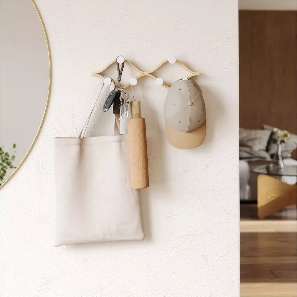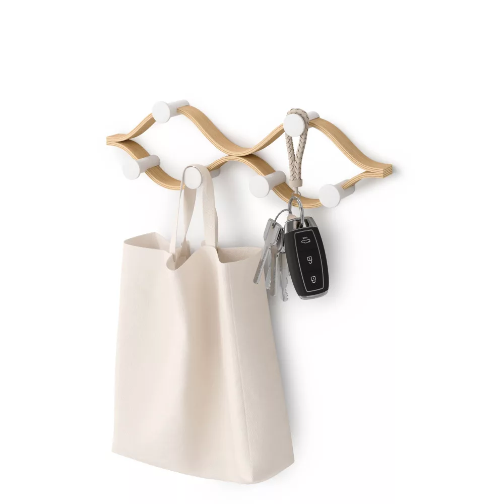 Ez a 43 cm széles, természetes fa-fehér színű fali fogas hat kampójával és környezetbarát anyagaival ideális megoldás az előszobai rendezettség fenntartására. Az elegáns, hajlított formatervezés harmonikusan illeszkedik bármilyen lakberendezéshez. Válaszd ezt a praktikus tárolót, és teremts otthonodban letisztult, rendezett teret, ahol minden kézre áll.