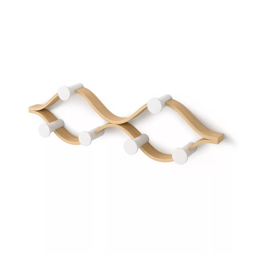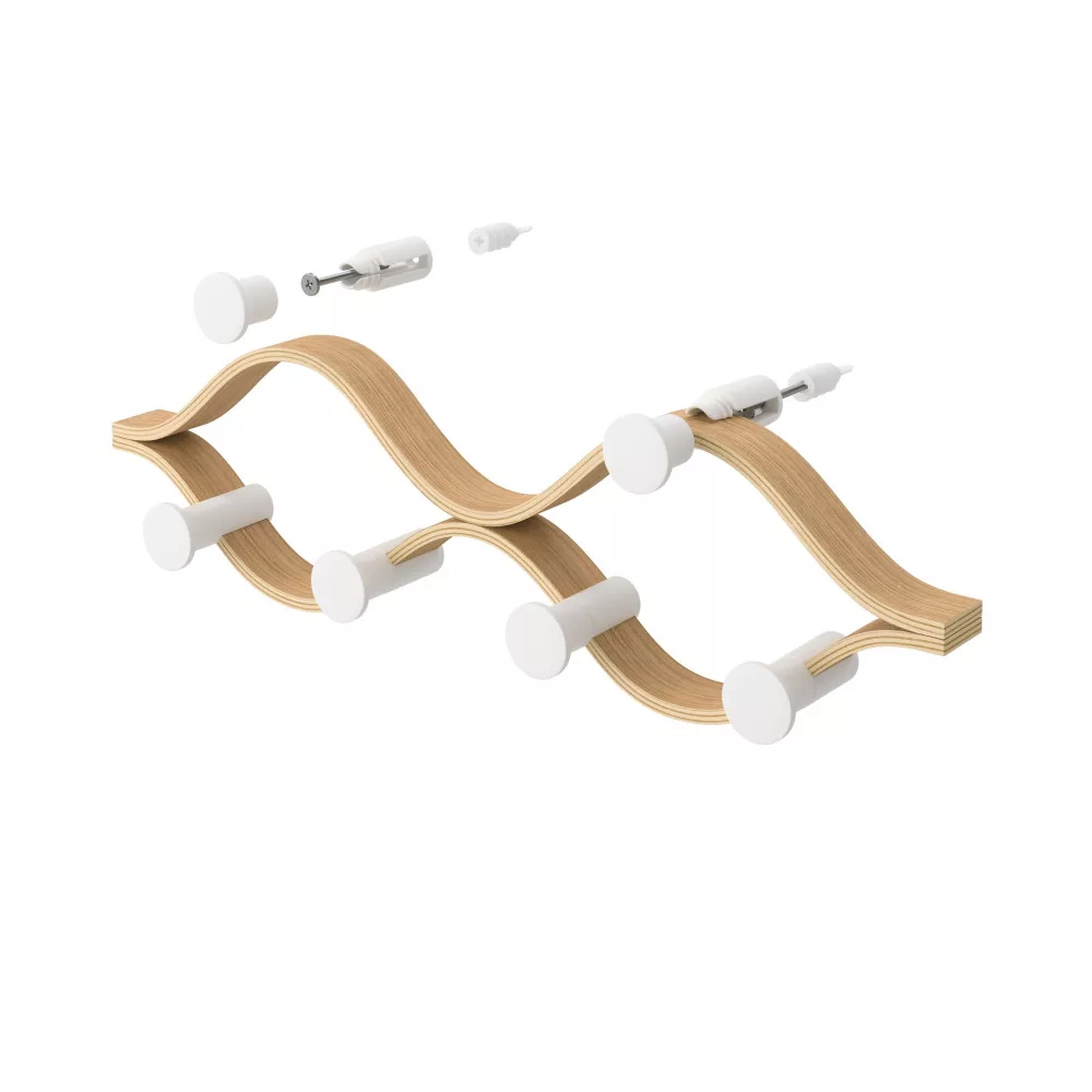 A fali fogas gumifa és kőrisfa kombinációjából, illetve újrahasznosított ABS-ből készült, amely optimális tartósságot és esztétikát nyújt. A 43 centiméter széles kialakítás hat kampót kínál, melyek hajlított formája megkönnyíti a kabátok, kalapok vagy sálak felakasztását. A természetes fa-fehér színösszeállítás kellemes, meleg hangulatot teremt az előszobában vagy más beltéri helyiségekben.