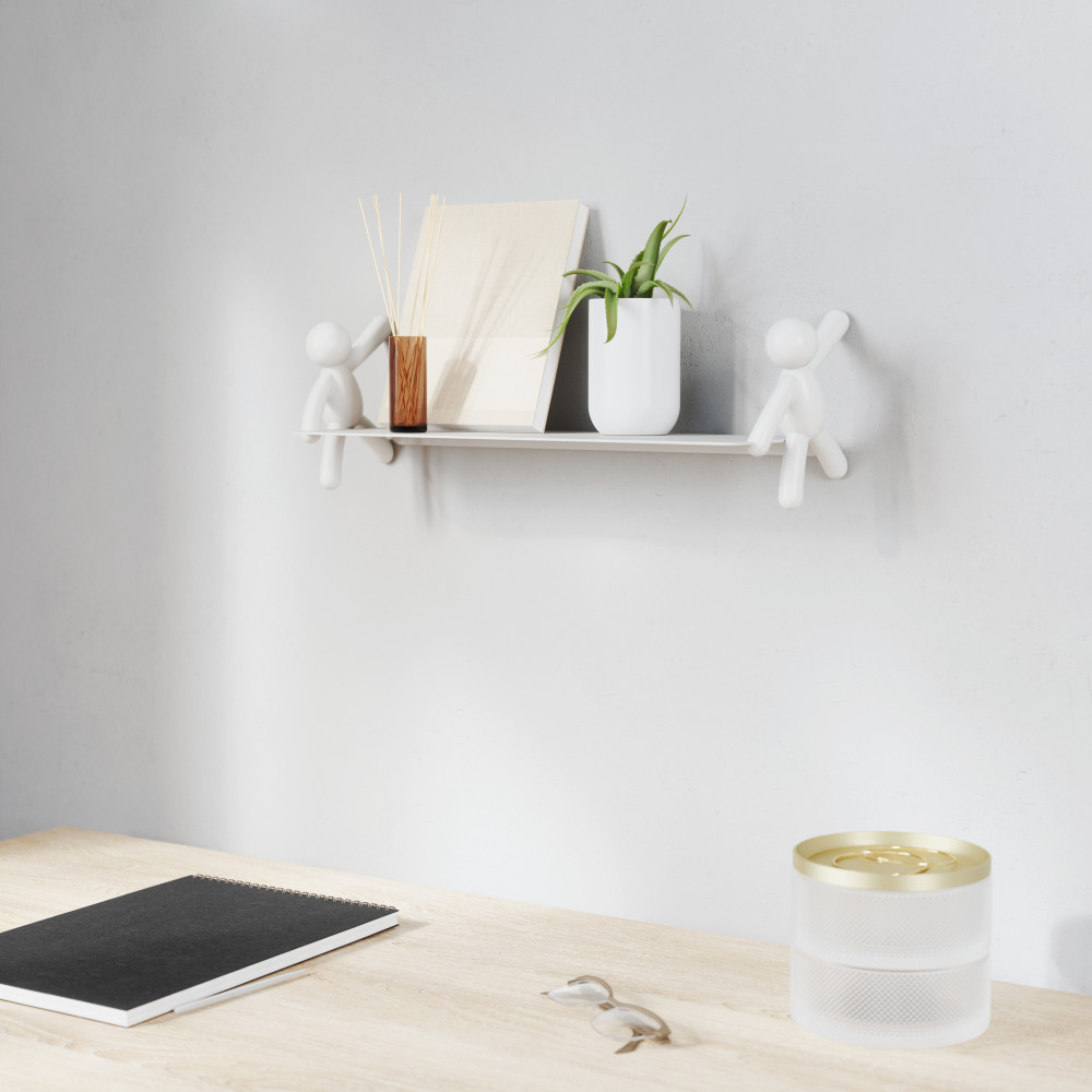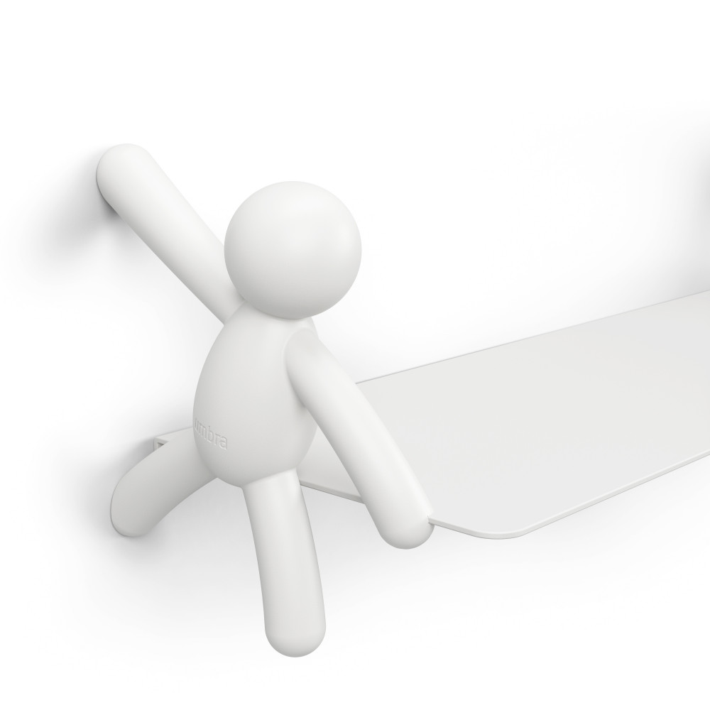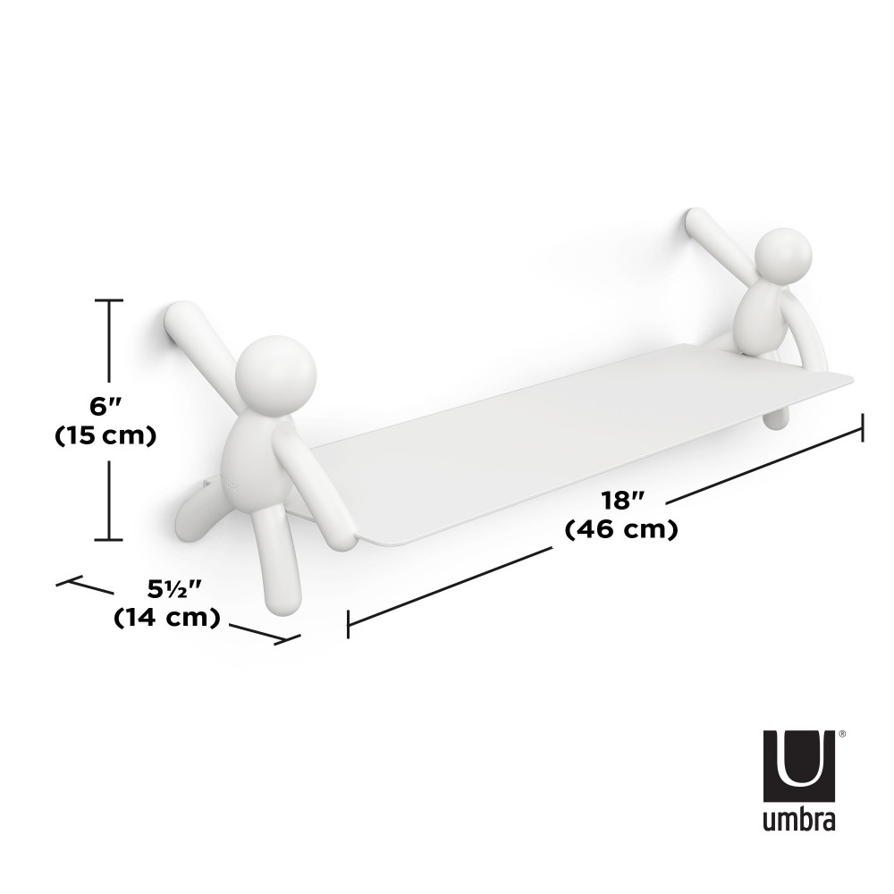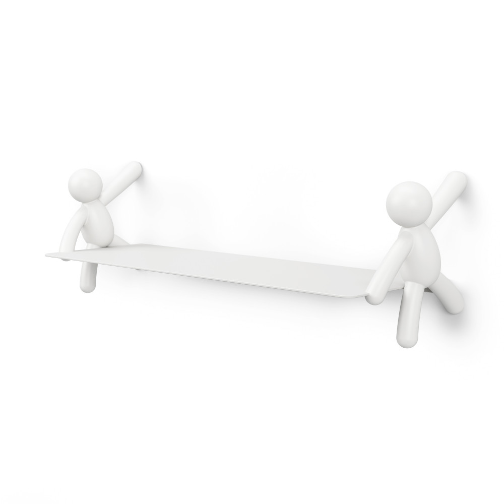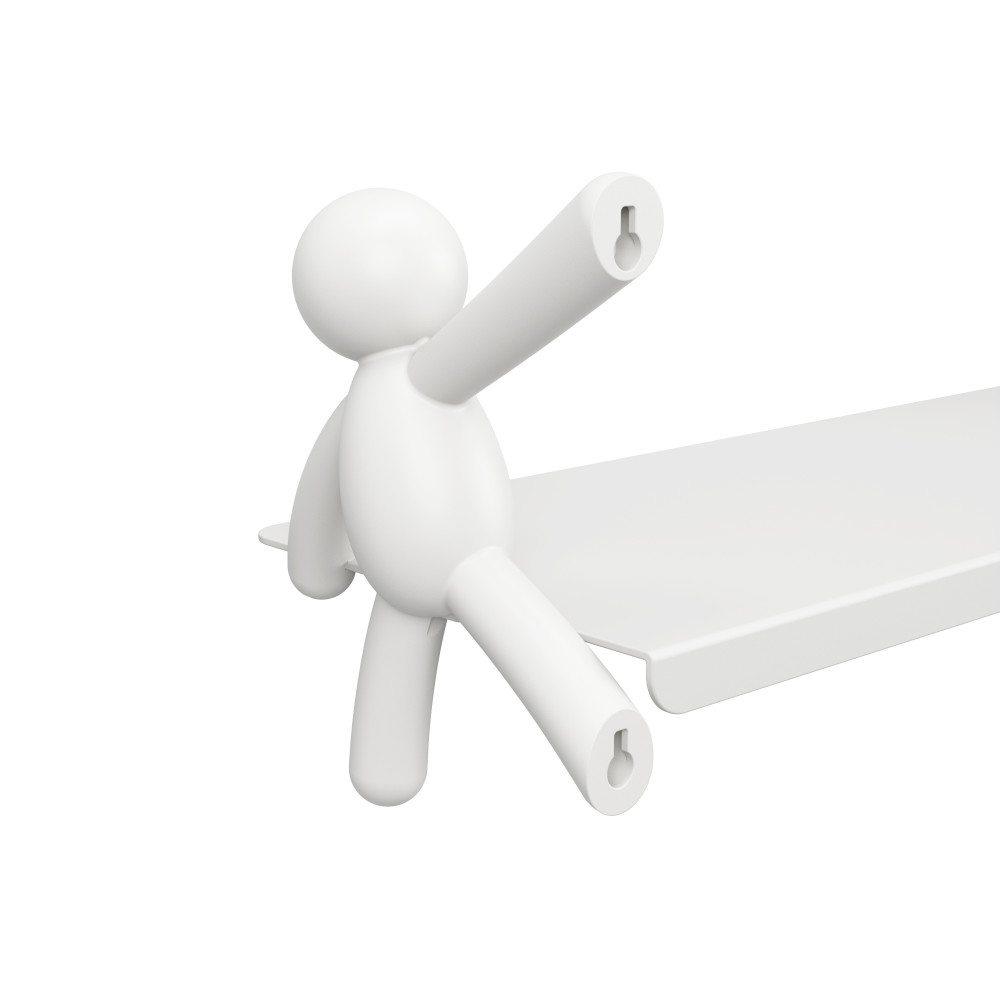 A polc anyaga strapabíró, sima felületű, fehér színű kompozit, amely könnyen tisztán tartható és illeszkedik bármilyen enteriőrhöz. Mérete 45,7 cm széles, 17,7 cm mély és 7,6 cm magas, így elegendő helyet biztosít kisebb könyvek, dísztárgyak vagy játékok számára. A polc súlykorlátja 4,5 kg, ami a mindennapi használathoz ideális. A polc különlegessége a két oldalán elhelyezett barátságos figura, amely mintha a polcot tartaná, ezáltal játékos és barátságos látványt nyújt.