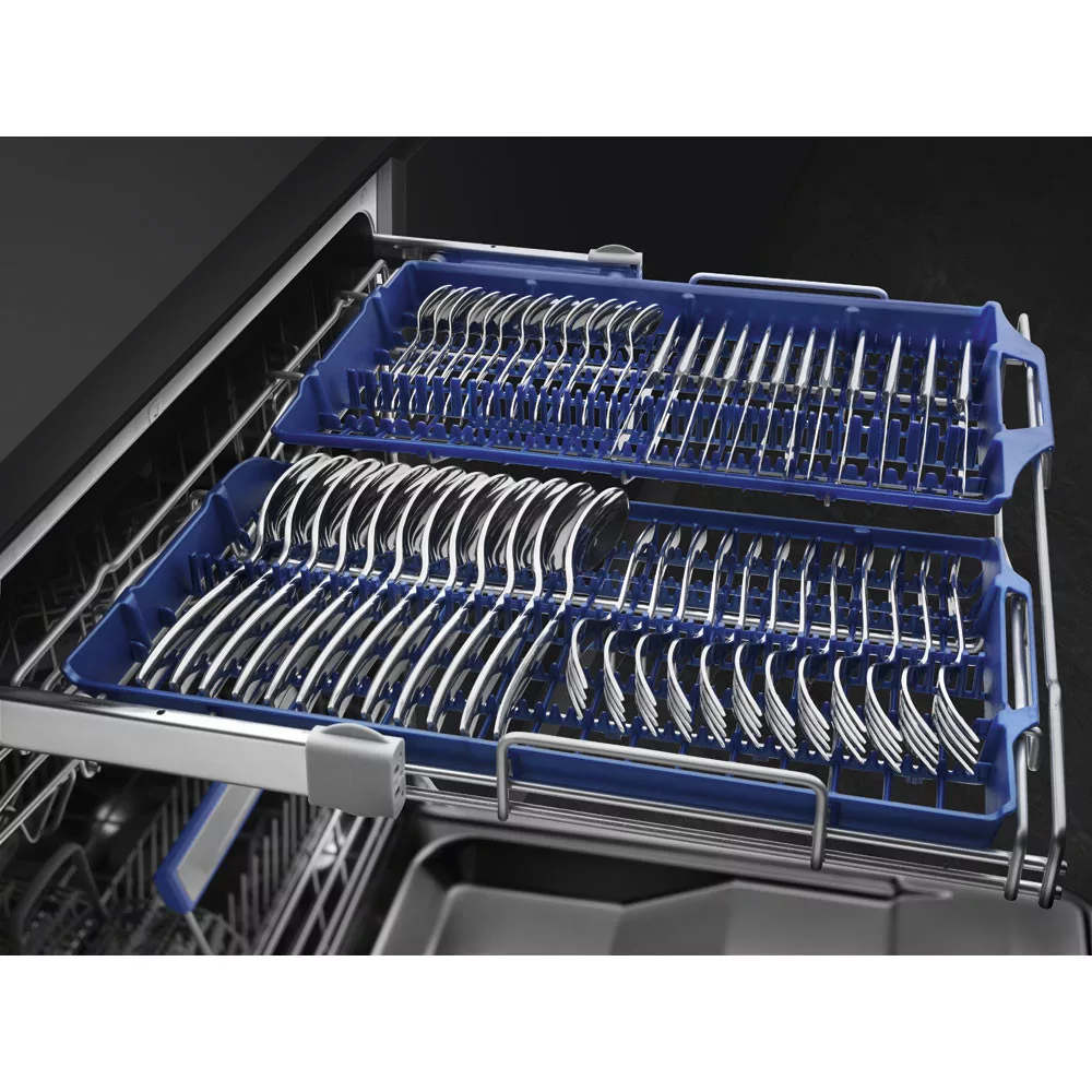 82 cm magas, fekete ajtópanel, 13 teríték, 11+4 funkció, LED kijelző, 7 hőm., 44 dB, három FlexiDuo kosár, teljes Aquastop, ActiveLight LED világítás, automata ajtónyitás